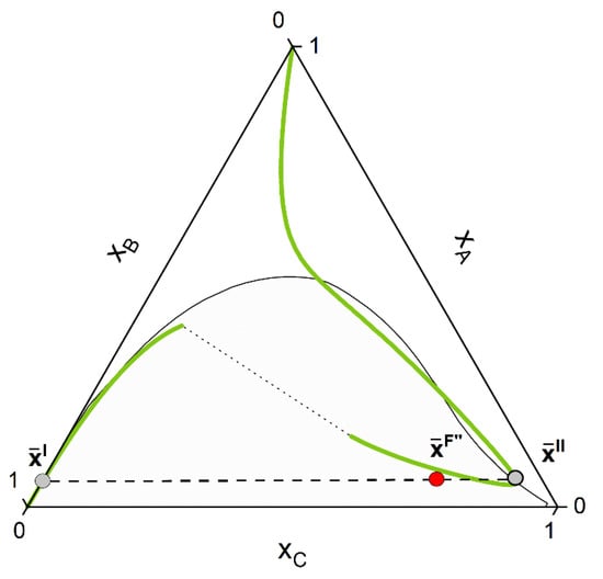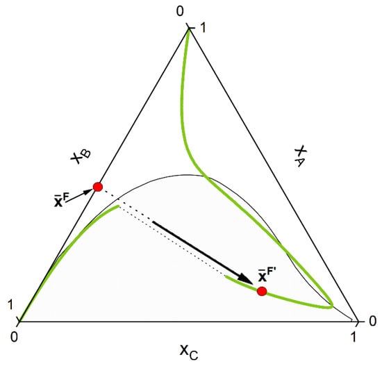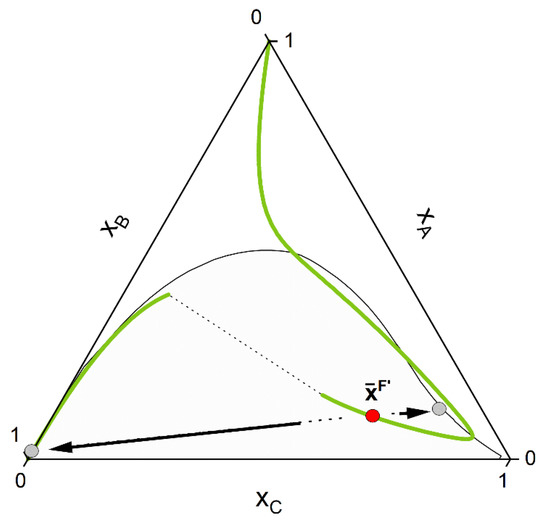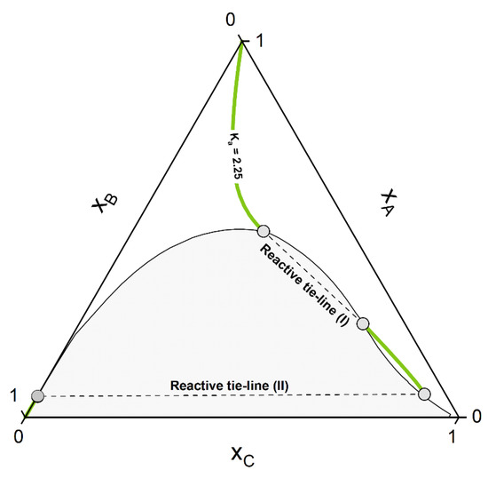 - First the feed composition , the temperature p and the pressure T is given. Initially, an homogeneous CE calculation is performed at these conditions, according to the stoichiometry of the defined key reactions . This is equivalent to moving the composition point, along a trajectory imposed by the stoichiometry called stoichiometry line, to the (hyper-)surface (composition ) where the CE condition for each key reaction is fulfilled (Equation (8)). For a simple reaction and the corresponding ternary phase diagram, this chemical equilibration step can be visualized in Figure 4.
