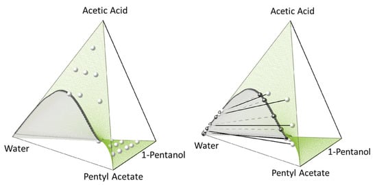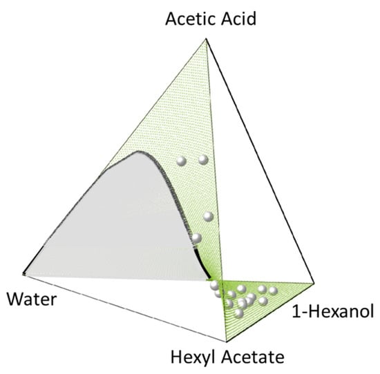- Toikka, M.A.; Vernadskaya, V.; Samarov, A. Solubility, liquid-liquid equilibrium and critical states for quaternary system acetic acid–n-amyl alcohol–n-amyl acetate–water at 303.15 K and atmospheric pressure. Fluid Phase Equilibria 2018, 471, 68–73. [Google Scholar] [CrossRef]