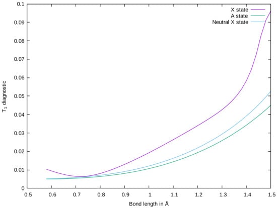 T Diagnostic vs. C–O bond length for selected electronic states of CO and neutral CO.