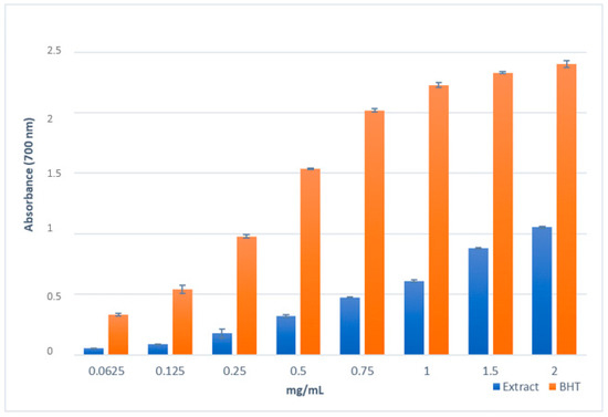 The reducing power reflects the ability to stop the radical chain reaction. In this assay, the presence of antioxidant compounds in the sample determined the reduction of Fe3+ to the ferrous form (Fe2+); this reduction is highlighted by spectrophotometric measurement (700 nm) of the change of yellow colour of the test solution to various shades of green and blue, depending on the reducing power of the antioxidant sample. Figure 3 shows the results of the reducing power of methanol extract obtained from biomass of in vitro culture of Scutellaria brevibracteata subsp. subvelutina; the extract displayed moderate activity, which was dose dependent, compared to the standard BHT. The effect was lower than BHT, as also evidenced by ASE/mL values (10.15 ± 0.67 and 0.89 ± 0.06 ASE/mL, respectively) (Figure 3).