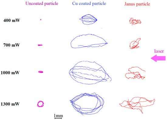Top View (horizontal component of the active Brownian motion). Dust particle trajectories in the DC discharge stratum during the time Δt = 1 s, at different laser powers Wlas: 400, 700, 1000 and 1300 mW. Left row is uncoated dust particle; the central row is the Cu-coated dust particle; right row is the dust Janus particle.