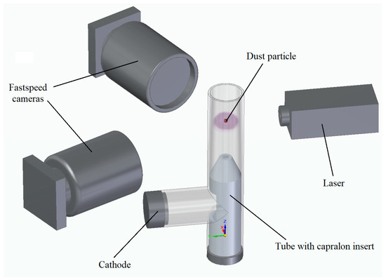 Figure 6 shows the scheme of the experimental setup. The experiment was carried out in a vertically oriented glass discharge tube with a length l = 1250 mm and an inner diameter D = 40 mm. The distance between the cathode and anode was 1050 mm. The lower end of the tube was closed while the upper end was connected to a pressure control system. In addition, on top was the injector of dust particles. The tube was evacuated using a turbomolecular pump and filled with an inert gas (argon) to a working pressure of p = 10 Pa. Next, using a “Spellman” power source, a DC glow discharge was ignited between the anode and cathode. The main discharge parameters are as follows: voltage U = 2.0 kV and current I = 1.25 mA. During the experiment, argon was continuously fed into the discharge tube at a rate of 4 standard cm3/min, which made it possible to maintain the properties of the plasma unchanged.