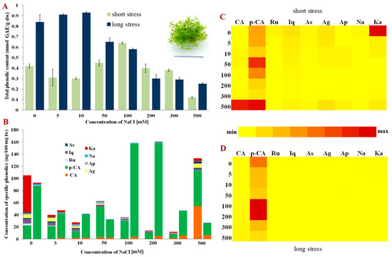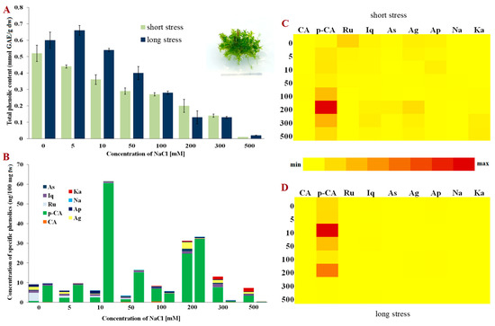 As was the case in P. patens, p-coumaric acid was the dominant phenolic acid during salt stress in bryo-halophyte E. hungaricus (Figure 2B). These two species are phylogenetically closer, funaroid mosses, and belong to the same Funariaceae family. Nevertheless, the concentrations, as well as the diversity of the identified phenolics, were lower than those in P. patens, which also resulted in lower total phenolic contents (Figure 2A). In the plants exposed to low NaCl under short-term stress, rutin, astragalin and apigenin were present, whereas the concentration of kaempferol increased in those plants exposed to 300 and 500 mM of NaCl. Interestingly, kaempferol was not detected at all in long-term NaCl stress (Figure 2B,D). The relative presence of specific phenols indicates that p-coumaric acid is the dominant phenolic acid playing the main role in the response of E. hungaricus, especially in plants exposed to long-term stress.