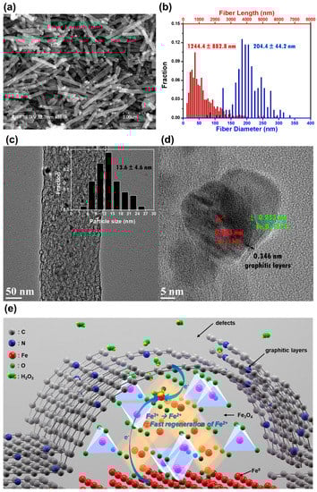 SEM image of Fe3O4/Fe/Fe3C@PCNF, (b) The distribution of length and diameter of fibers in (a), (c) Low-magnification TEM image of Fe3O4/Fe/Fe3C@PCNF. Dark spots correspond to the catalyst nanoparticles dispersed throughout PCNF. The inset displays the size distribution of these nanoparticles. (d) High-magnification TEM image of the vicinity of catalyst particles positioned at the outermost edge of PCNF. (e) The suggested mechanism of extremely fast H2O2 catalytic decomposition by Fe3O4/Fe/Fe3C@PCNF. Reproduced with permission from RSC from [58].