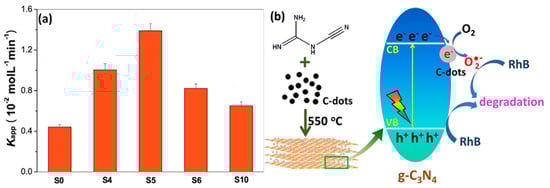 (a) Comparison of the degradation rate constant of C-dots-modified g-C3N4 (b) Schematic diagram showing the one-pot synthesis of C-dots-modified g-C3N4 with enhanced photocatalytic activity. Reproduced with permission from Elsevier [113].