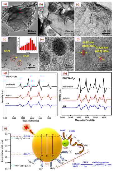 TEM (a–c) and HRTEM (d–f) images of CN, NCN22, and 2NCD/NCN. ESR spectra of radical adducts trapped by DMPO in C3N4, NCN22, and 2NCD/NCN under visible-light irradiation in (g) aqueous dispersion for DMPO-OH• and (h) methanol dispersion for DMPO-O2•−. (i) The proposed photocatalytic mechanism for the simultaneous degradation of 4NP and reduction of Cr(VI) under visible-light irradiation. Reproduced with permission from Elsevier [119].