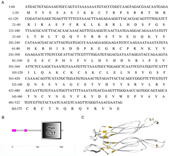 IL17 is one member of the most ancient cytokine family; six IL17 family ligands (IL17A-F), as well as five receptors of them (IL17RA-E), have been identified in mammals [14]. Structurally, these cytokines generally embrace an IL17 domain at the C-terminus, where four conserved cysteine residues form intra-chain disulfide bonds to promote dimerization [15]. The unique structural characteristics of 4-cysteine enable IL17 to fulfill its function by binding or interacting with its specific receptors, meanwhile providing a basis that distinguishes IL17 sequences from other cytokines [16]. Unlike traditional inflammatory cytokines, activated T lymphocytes and other cell types relevant to the host immunity, such as the neutrophils and the mucosal epithelial cells, produce IL-17s [17,18]. Nevertheless, IL17 plays a fundamental role in innate immunity as its secretion triggers the production of a large number of chemokines, leading to the recruitment of neutrophils and macrophages, which, in turn, clear pathogens [19]. By this means, IL17 mediates the interaction between the innate and adaptive immunity, thereby coordinating an effective immune response [20].