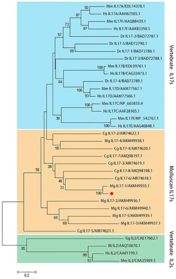 Phylogenetic analysis of McIL17-1. The phylogenetic tree is constructed using MEGA-X software with 2000 replications of bootstrap in the way of the neighbor-joining method. McIL17-1 is labeled with a red dot. Species included in the phylogenetic tree are all retrieved from the GenBank database and accession numbers are also listed in the tree. Sequences from various species are abbreviated as follows: Hs, Homo sapiens; Mm, Mus musculus; Bt, Bos taurus; Dr, Danio rerio; Gg, Gallus gallus; Mg, Mytilus galloprovincialis; Cg, Crassostrea gigas.