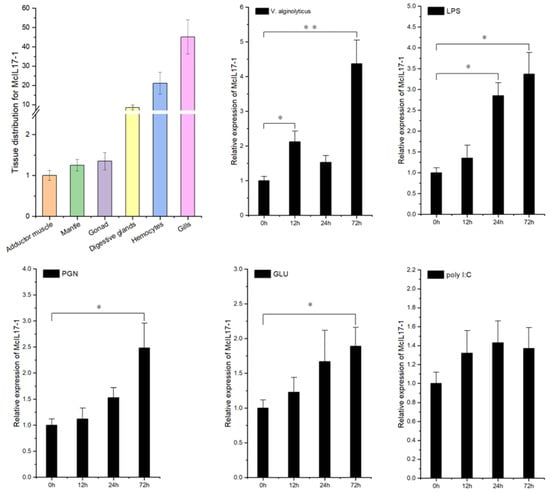Expression profile analysis of McIL17-1 transcripts in common adult tissues and after challenge with live V. alginolyticus, lipopolysaccharide (LPS) (from Escherichia coli O111: B4), peptidoglycans (PGN) (from Staphylococcus aureus), glucan (GLU) (from Saccharomyces cerevisiae), or polyinosinic-polycytidylic acid (poly I:C), respectively. The results were expressed as mean ± S.D. (n = 3). Significant difference relative to control is indicated with asterisk symbol (* p < 0.05, ** p < 0.01).