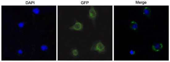 Due to the absence of mature mussel cell lines, the cellular localization of McIL17-1 was examined in the HEK293T cells through the transfection of the constructed pEGFP-N1-McIL17-1 plasmid. Under a fluorescence microscope, the green fluorescence of GFP-labeled McIL17-1 was primarily found in the cytoplasm (Figure 4).