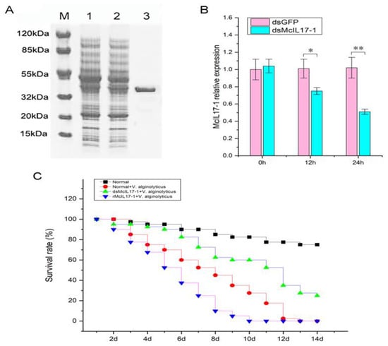 Effects of silencing and overexpression of McIL17-1 on survival rate of mussels. (A) SDS-PAGE analysis of rMcIL17-1. Lane M: protein molecular standard; lane 1: negative control for rMcIL17-1(without induction); lane 2: transfected rMcIL17-1; lane3: purified rMcIL17-1. (B) McIL17-1 was silenced through dsRNA injection. (C) The survival rate (%) of mussels prior to dsMcIL17-1 and rMcIL17-1 injection following V. alginolyticus challenge. **, p < 0.01, *, p < 0.05 versus the controls.