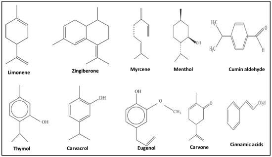 The other organic compounds inherent to EOs may be classified under functional groups such as alkenes (myrcene), alcohols (menthol), aldehydes (cumin aldehyde), phenols (thymol, carvacrol, and eugenol), ketones (carvone), and carboxylic acids (cinnamic acid) [17,24]. The structures of some common essential oil (EO) compounds with different functional groups are presented in Figure 1. The chemical/ bioactive compound composition of EOs differs among plant species and varies based on several factors such as geographical location, stage of plant maturity, season, geography, and part of the plant from which the EO has been extracted, amongst a myriad of other factors [26,27]. The bioactive compounds of EOs have been observed to undergo degradation and lose their pharmacological properties when exposed to factors like light, oxygen, or high temperatures [28].