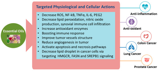 Targeted actions of EOs for the reduction of inflammation and cancer.