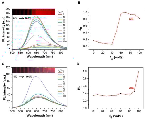 (A) PL intensity at different fw (10 μM) and the photograph of mixtures with increasing volume fractions of water (from left to right) under 365 nm UV light. (B) The relative PL intensity against water content. (I0: PL Intensity of 70% H2O). (C) PL intensity of BY1 in ethanol/glycerol mixture with varied fg (10 μM) under 365 nm UV light. (D) The relative PL intensity against glycerol content. (I0: PL Intensity of 100% glycerol).