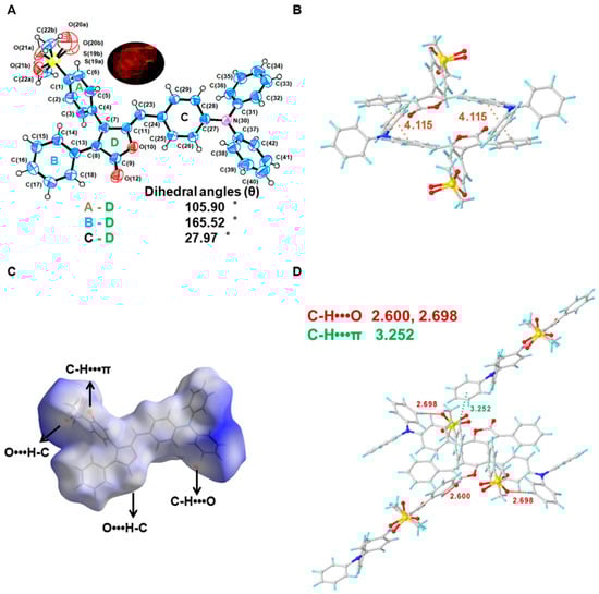 (A) ORTEP diagram and relevant dihedral angles of compound BY1 (50% ellipsoidal probability). (B) Centroid distance of benzene ring between adjacent molecules. (C) The Hirshfeld surfaces of BY1 mapped with dnorm. (D)The interactions between adjacent molecules.
