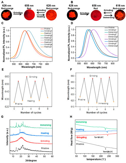 (A,B) Switching the light emission of BY1 via grinding, immersing and heating processes. These photos were taken under 365 nm UV light. (C) Normalized PL spectra of BY1 in the pristine state, grinding state, and the state after heating at 80 °C. (D) Normalized PL spectra of BY1 in the pristine state, grinding state, and the state after immersing with acetone. (E) The repeated cycles of BY1 via the grinding–heating processes at 80 °C. (F) The repeated cycles of BY1 via the grinding–immersing processes. (G) PXRD of BY1 in different states: pristine, grinding, heating, and immersing with acetone. (H) DSC of BY1 in different states: pristine, grinding, heating, immersing with acetone.