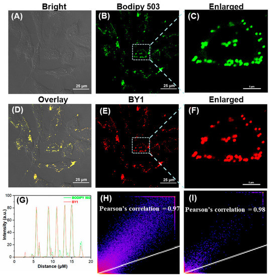 To explore the application of BY1 in LDs imaging in living cells, the potential cytotoxicity was evaluated using the Cell Counting Kit-8 (CCK8) assay and low cytotoxicity was observed (Figure S8). Next, the LDs imaging in HeLa cells was investigated via CLSM to confirm the specificity of the BY1 for LDs and the co-localization experiment was conducted by incubating HeLa cells with BY1 and Bodipy 503 (Figure 6). As illustrated in Figure 6E, BY1 selectively accumulated in LDs and displayed bright red fluorescence. Additionally, the staining pattern of BY1 was almost identical to the staining results of Bodipy 503 (Figure 6B–D). Moreover, a high overlap of the intensity profiles of BY1 and Bodipy 503 in the region of interest (ROI) was observed, and the intensity changes were closely synchronized (Figure 6G), which suggests a high overlap between BY1 and Bodipy 503. The Pearson’s correlation of the green channel (Figure 6B) and the red channel (Figure 6E) was calculated with a value up to 0.97 [22], indicating the powerful LDs-specific targeting capability. These results support the theory that BY1 is a promising NIR fluorescent probe for LDs imaging.