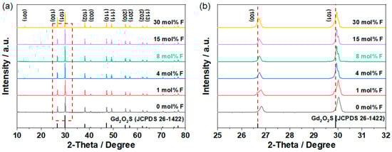 (a) XRD profiles and (b) local magnified view of the GOS:Tb, xF scintillators.