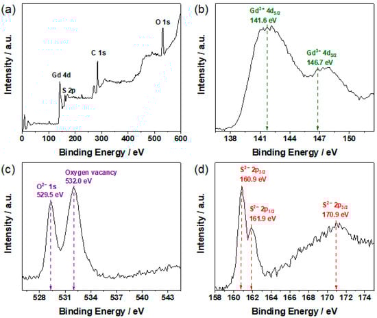 XPS results for the GOS:Tb, 0.08F scintillators. (a) XPS survey spectrum, (b) Gd3+ 4d, (c) O2− 1s, (d) S2− 2p.