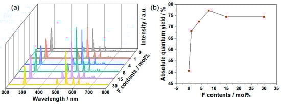 The excitation spectra and emission spectra of GOS:Tb, xF scintillators with respective dopant levels of 0, 1, 4, 8, 15 and 30 mol% are displayed in Figure 5a. As presented in Figure 5a, when the emission wavelength was 545 nm, the excitation spectra showed an excitation peak (λex = 298 nm) between 200 and 400 nm, which was derived from the 4f–5d transitions of Gd3+ [32]. Consequently, the emission spectra for GOS:Tb, xF scintillators were measured under light excitation levels of 298 nm (Figure 5a). In addition, a series of emission peaks appeared in the emission spectrum range of 400–800 nm. These emission peaks were mainly located at 494 nm, 545 nm, 589 nm, 623 nm, 671 nm and 683 nm, corresponding to the 5D4→7F6, 5D4→7F5, 5D4→7F4, 5D4→7F3, 5D4→7F1 and 5D4→7F0 electronic transition, respectively. These emission spectra indicate that the GOS:Tb, xF scintillators have similar emission peaks, among which the strongest emission peak was 545 nm, which can be attributed to the 5D4→7F5 transition of Tb3+ [33]. Furthermore, it is clear that the F doping level had an effect on emission intensity. With the increase in the F doping level, the emission intensity of GOS:Tb, F scintillators showed a trend of increasing first and then decreasing. When the doping level of F was 8 mol%, the emission intensity was at its best. Due to the concentration quenching effect, the emission intensity decreased when the doping level increased further. The absolute quantum yields (QY) of the resultant scintillators were determined and shown in Figure 5b (λex = 298 nm). Consequently, the QY of F in GOS:Tb, xF scintillators were revealed to be approximately 50.72, 68.1, 72.31, 77.21, 74.49, 74.47, when the F levels were 0, 1, 4, 8, 15 and 30 mol%, respectively. It is evident that the highest emission intensity was an F doping amount of 8 mol%, which is in agreement with the emission spectra results. The doping of F- ions can generate impurity levels above the top of the valence band when composed of p orbital of oxygen [34]. These impurity levels can be combined with excited electrons to become hole traps to generate fluorescence, and thus improve the luminosity intensity. The replacement of O2− with a certain amount of F− ions could improve the energy transfer efficiency from the GOS host material to Tb3+, and contribute to the resulting Tb3+ fluorescent transition [35,36]. However, with the increase in the amount of F− ions, new intrinsic defects will be formed, which will lead to a reduction in the energy transfer efficiency and emission intensity [37].