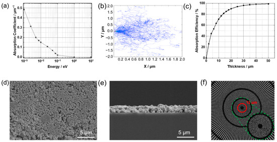 (a) Absorption coefficient of the GOS:Tb scintillation screen under different energy neutrons. (b) The track of the internal conversion electron (Energy: 38.68 keV) in the scintillation screen. (c) The neutron absorption efficiency of scintillation screens of different thicknesses. SEM photographs of the GOS:Tb, F scintillation screen prepared with PVB, (d) surface morphology, (e) cross-sectional view. (f) Results of resolution tests using gadolinium Siemens star.