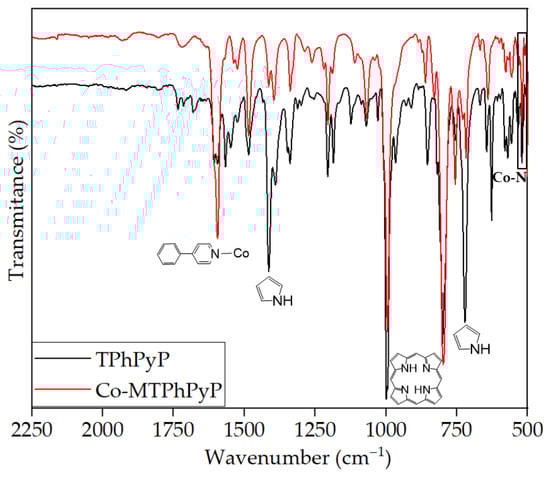 FTIR spectra of porphyrin TPhPyP (black) and Co-MTPhPyP (red).