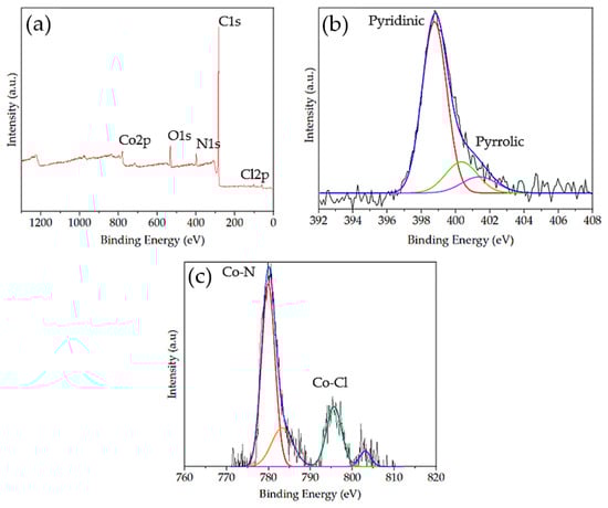 XPS spectra confirmed the presence of C, N, Co, and Cl in Co-MTPhPyP (Figure 4a). The signals of C 1s peak at 285.03 eV, Cl 2p at 199.43 eV, N 1s at 399.21 eV and Co 2p at 780.16 eV and 795.88 eV were observed. The surface atomic percentages of C, N, O, Cl, and Co are 85.91, 5.4, 6.52, 0.51, and 1.66%, respectively. The high-resolution N1s spectrum (Figure 4b) indicates the presence of three predominant nitrogen signals, which include pyridinic N at 398.76 eV, pyrrolic N at 400.32 eV, and quaternary N at 401.5 eV. The signal at 398.76 eV includes the contribution of the nitrogen–cobalt (N-Co) bond due to the small difference between the binding energy of Co-N and N-pyridinic [25,26]. The de-convulsion of Co signals is presented in Figure 4c. Signals at 779.99 eV and 795.7 eV were assigned to Co peaks 2p3/2 and 2p1/2 with zero valence. Furthermore, several authors show that signals around 780 eV and 795 eV are attributed to the binding energy of Co-N and Co-Cl, respectively [25,26,27].