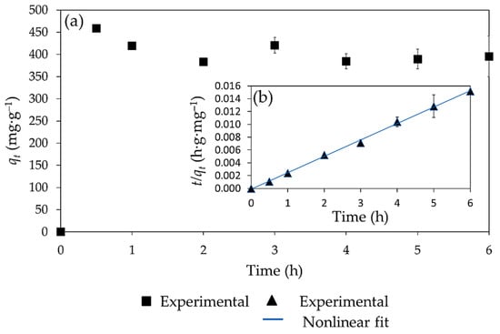 The data for the kinetic study of Pb(II) adsorption are presented in Figure 8. The results show that the maximum adsorption capacity was reached in a short time (30 min) with an adsorption capacity of 458.8 mg g−1 (Figure 8a). Likewise, it was possible to observe that longer exposure time caused a desorption effect of up to 78 mg g−1 after 2 h of contact, possibly due to competition and interactions with H+ protons. Therefore, optimal contact time to carry out the adsorption of Pb(II) was 30 min. This result is consistent with some recent research. For example, Yu et al. [34] using a tetracarboxyphenyl porphyrin (TCCP) doped with a magnetic compound, obtained an adsorption capacity of 384 mg g−1, in 6 min at an initial concentration Pb(II) concentration of 16 mg L−1. In another study, Liu et al. [35] functionalized cotton fibers with tetramethylpyridine porphyrin (TMPyP) for the adsorption of Cd(II), obtaining an adsorption capacity of 97.1 mg g−1 after 2 min of exposure. This indicates that the adsorption capacity of Co-MTPhPyP towards Pb(II) could be improved using a shorter adsorption time. Moreover, the analysis FTIR, showed that characteristic signals of Co-MTPhPyP (1592 cm−1, 1605 cm−1, 1384 cm−1, 998 cm−1, 798 cm−1, 521 cm−1) after the adsorption process (6 h of reaction) were not significantly modified (Figure S3).
