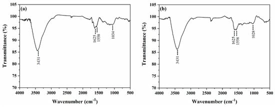 Figure 2 shows the FTIR spectra of MAC1105 (Figure 2a) and MAC111 (Figure 2b). Bands at 3431, 1625, and 1558 cm−1 can be observed for both materials. The bands at 3431 cm−1 can be ascribed to the stretching vibrations of O–H bonds from alcohols, phenols, or carboxyls present as functional groups on the surface of the MACs and can also be ascribed to the presence of adsorbed water [42]. The bands at 1625 cm−1 can be attributed to the C=O bonds [43]. At 1558 cm−1, the bands observed can be attributed to the C=C stretching vibrations of the aromatic rings of the activated carbons’ structure [44]. Besides that, bands at 1034 e 1028 cm−1 can be observed for MAC1105 and MAC111, respectively, and are due to the C–O stretching vibrations of hydroxyl in alcohols, phenols, or carboxyls [45].