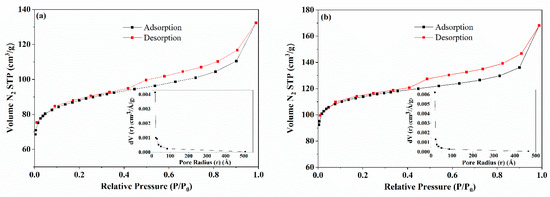 Figure 3 shows the N2 adsorption/desorption isotherms and the BJH desorption pore size distributions for MAC1105 (Figure 3a) and MAC111 (Figure 3b). According to the IUPAC classification of adsorption isotherms, the adsorption isotherms of both materials were Type IV, accompanied by hysteresis [46]. Type IV isotherm is a characteristic of mesoporous materials. The adsorption hysteresis exhibited by both MACs was Type H4. This type of hysteresis loop is characteristic of micro/mesoporous carbonaceous materials [46]. From the pore size distribution, mesopores are observed for both materials.