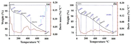 Figure 4 shows the thermal profile of the produced MACs. The thermal behavior was evaluated from room temperature to 800 °C under an N2 atmosphere. The curve obtained for MAC1105 can be divided into four regions, while the curve obtained for MAC111 can be divided into five regions. The first region of weight loss was 21.4–98.9 °C and 19.9–104.9 °C for MAC1105 and MAC111, respectively, and can be attributed to the evaporation of moisture [37,51]. The temperature range for the second region of weight loss was 98.9–253.9 °C and 104.9–217.4 °C for MAC1105 and MAC111, respectively. This stage corresponds to the loss of water from the channels and pores of the material [37,51]. The weight loss sum until these temperatures were 7.37% for MAC1105 and 9.60% for MAC111. The third region of weight loss varied from 253.9–463.9 °C MAC1105. For MAC111, a third stage of weight loss occurred from 217.4–367.4 °C, and a fourth stage occurred from 367.4–504.9 °C. These stages of weight loss can be assigned to the decomposition of oxygenated functional groups on the activated carbon surface [39]. The last stage for MAC1105 (fourth stage) was 763.9–798.9 °C, and the last stage for MAC111 (fifth stage) was 504.9–793.3 °C. These weight-loss stages correspond to the carbon matrix’s oxidation [51]. The total weight loss was 21.74% for MAC1105 and 24.80% for MAC111.