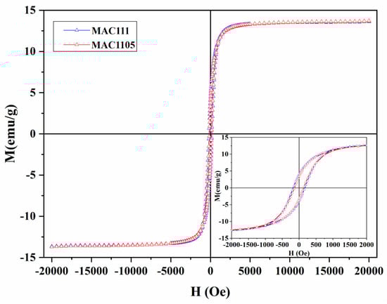 Magnetization curves of the MACs are shown in Figure 6, and the values of the hysteresis parameters are shown in Table 2. As can be seen, both exhibit ferromagnetic properties, with coercivity (HC) values of 150.2 Oe and 200.2 Oe and remanence (MR) values of 3.2 emu g−1 and 4.1 emu g−1 for MAC1105 and MAC111, respectively. These are interesting values for this kind of material [37,52,53]. On the other hand, the saturation magnetization (MS) value, 13.6 emu g−1 for both MACs, is slightly lower than that which the literature reported [37,52,53]. Despite the relatively low MS value, the MACs produced can be easily moved and controlled in aqueous media by external magnetic fields.