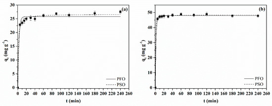 The kinetic behavior of BB dye adsorption was studied for both MACs with an initial adsorbate concentration of 50 mg L−1 and pH 4. The adsorption capacity curves as a time function are shown in Figure 7a,b for MAC1105 and MAC111, respectively. It is possible to observe that the curve obtained for MAC111 was characterized by a faster adsorption rate. MAC111 reached equilibrium in around 10 min. For MAC1105, the equilibrium was reached in around 60 min. This behavior can be explained due to the higher total pore volume presented by MAC111 (Table 1). A high pore volume can enhance the kinetic of adsorption by allowing a faster diffusion rate of the dye molecules inside the pores to the adsorption sites [54].