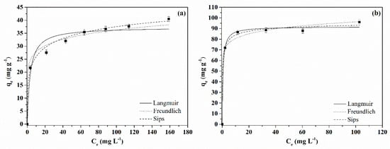The equilibrium study for BB dye adsorption was carried out at 25 °C with initial adsorbate concentrations from 0 to 200 mg L−1 and pH 4. Figure 8 shows the equilibrium curves obtained for MAC1105 (Figure 8a) and for MAC111 (Figure 8b). According to Giles classification [58], the isotherms obtained for MAC1105 and MAC111 are typical type L1 and L2 isotherms, respectively. L-type isotherms indicate a high affinity between the adsorption sites of the adsorbent and the adsorbate molecules. Besides that, it is possible to observe (Figure 8b) that MAC111 presented a higher adsorption capacity than MAC1105. This result can also be explained due to the superior textural features exhibited by MAC111 (Table 1). The higher surface area presented by MAC111 makes more surface active sites available to capture the adsorbate molecules.