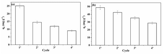 Different chemical agents in different concentrations were tested for regenerating the MACs. Table 6 shows the equilibrium adsorption capacity for the second cycle of adsorption. It can be seen that the best results were obtained using NH4OH in the concentration of 0.5 mol L−1 for both MACs. Therefore, additional adsorption/regeneration cycles were performed using this regeneration condition to access the potential of reusing both materials. Figure 9 shows the equilibrium adsorption capacity of BB dye for four cycles using MAC1105 (Figure 9a) and MAC111 (Figure 9b). It is possible to notice that the adsorption capacity gradually decreased over the cycles. This trend suggests that some BB dye molecules were not removed from the adsorbent surface upon regeneration. Therefore, the active sites occupied by these molecules become unavailable for adsorption in the next cycle.