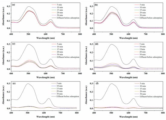 Absorption spectra of simulated effluent before and after adsorption with 1 g L−1: (a) MAC1105 and (b) MAC111; 5 g L−1: (c) MAC1105 and (d) MAC111; 10 g L−1: (e) MAC1105 and (f) MAC111.