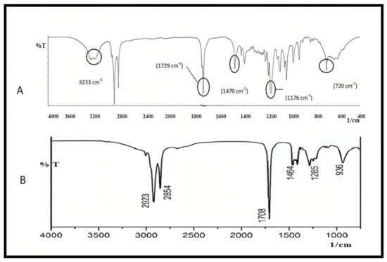 FTIR spectra of (A) GMS and (B) oleic acid, plot of %Transmittance vs. 1/cm.