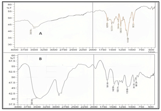 FTIR for pure curcumin (A), the optimized formulation of curcumin–NLC F1 (B), which shows no chemical interaction with curcumin major peaks, plot %Transmittance vs. 1/cm.