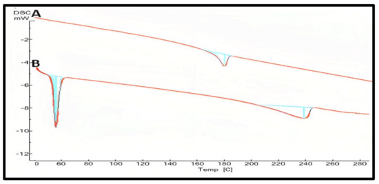 At 180.55 °C, pure curcumin’s melting endothermic peak was observed that complied with similar findings [49,50]. Moreover, other formula excipients like lipids, ethanol, poloxamer 188, and tween 80 showed a thermogram that proves the compatibility of curcumin with all excipients used for the formulation. By detecting the fluctuation of the temperature and energy during the phase transition, DSC was an approach for investigating the crystallization or amorphous behavior of medication in pure and NLCs. The melting process for PRE reached a maximum peak temperature of 60.93 °C. The melting peak for the CUR, on the other hand, was not visible in the thermogram of the lyophilized CUR–NLCs with the presence of an oleic acid peak at 240 °C. The CUR entrapment in hydrophobic voids of GMS could explain the lack of a distinctive endothermic peak in the DSC thermogram of NLCs. Figure 7 showed the DSC thermogram of the selected formula F1 in comparison to pure curcumin. The removal of CURs endothermic peak in CUR–NLCs powder shows that the drug was molecularly disseminated in the lipid matrix and transformed from a crystalline to an amorphous state [47,51].