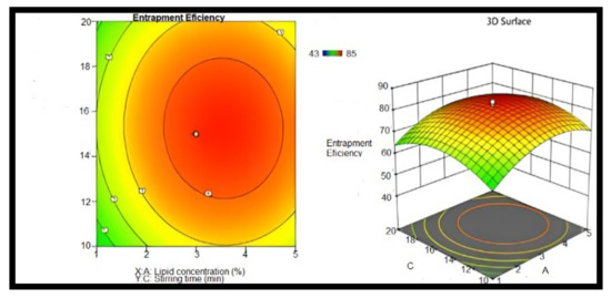 Counter and response surface plots of entrapment efficiency (stirring time and lipid concentration), n = 6.