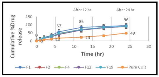 The in vitro drug release research was conducted at 37 °C for 24 h in a phosphate buffer (pH 6.8). Because curcumin is a lipophilic medication, it was added to the receptor medium to keep the sink conditions constant. The data clearly show that NLCs released the medication significantly more efficiently than a simple curcumin suspension. This can be ascribed to the phospholipidic nano formulations’ nanosized particles. Nanoparticles have a larger surface area, which improves the particle interaction with the dissolving liquid. Due to the release of curcumin adsorbed on the surface of nanoparticles, all of the curcumin-loaded NLCs showed a burst drug release over the first 4 h. Following that, the release of curcumin from the nanoparticles showed a regulated release pattern, with roughly 85% of the medication being released in the F1 formulation for up to 12 h, compared to ordinary curcumin. It could be attributed to the fact that curcumin, which is contained deep within the lipidic core and must travel along a longer diffusion path to reach the surface than a medication encapsulated near the surface, is hydrophobic [64]. The increased drug release from the F1 formulation compared to the other formulations (F2, F4, F12, and F19) could be attributed to the much smaller particle size, which increases the surface area and, as a result, the drug release rate [65,66].