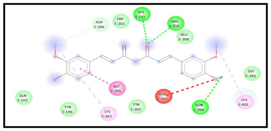For the 7KMB receptor, the curcumin interaction with the receptor in a complex represents a significant enhancement in the binding affinity through an energy reduction to −9.1 kcal/mol; the interaction also formed an additional four H-bonds compared to the two H-bonds formed for curcumin with NLC, indicating an increase in the curcumin affinity towards the receptor. The formed conventional H-bond showed a great increase through six formed bonds F: TYR202, F: SER511, F: SER511, F: ARG514, F: LYS562, and F: GLY395. Moreover, pi–anion, pi–pi stacked, and pi–alkyl were formed with F: ASP206, F: TYR202, and F: TYR202, respectively (Figure 13).