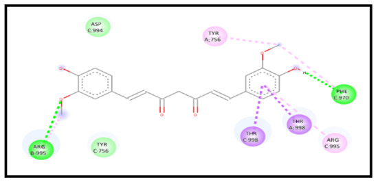 For the 7KNB receptor, interestingly, the curcumin interaction with the receptor in a complex represents a strong enhancement of the binding affinity through an energy reduction to −8.6 kcal/mol and formed a new extra five H-bonds, indicating a high increase in the curcumin affinity towards the receptor. The interaction showed six conventional H-bonds C: THR998, A: ARG995, A: ARG995, A: ARG995, B: ARG995, and B: VAL991, one carbon–hydrogen bond C: ASP994, one amide pi-stacked bond A: ASP994:C, O;ARG995, and 3 pi–alkyl bonds C: VAL991, A: ARG995 and B: ARG995 (Figure 14).