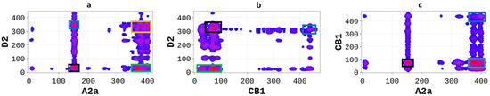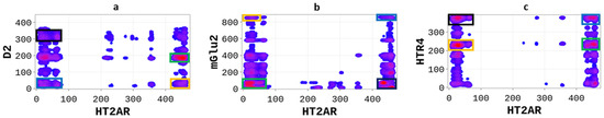 The interaction between the 5-HT2AR and mGluR2 has been extensively studied both experimentally and theoretically [28,29] over the last decades. However, these studies, achieved through FRET and molecular dynamics simulations, suggested that 5-HT2AR and mGluR2 could only heterodimerize at their transmembrane domains. Our SP-DCA analysis (Figure 3b) predicts additional hot-spots at the (1) N-terminal of 5-HT2AR (AA: M1-N75) and N-terminal of mGluR2 (AA: I19-I567) indicated by the green rectangle; (2) C-terminal domain of 5-HT2AR (AA: K385-V471) and the C-terminal domain of mGluR2 (AA: L820-G872) represented by the blue rectangle; (3) the C-terminal of 5-HT2AR (AA: K385-V471) and the N-terminal of mGluR2 (AA: I19-I567) represented by the black rectangle; (4) the N-terminal domain of 5-HT2AR (AA: M1-N75) and the C-terminal of mGluR2 (AA: L820-G872) represented by the orange rectangle.