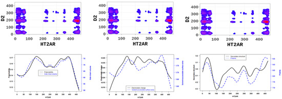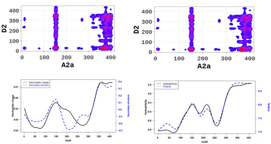 The SP-DCA analysis of the 5-HT2AR/D2R heterodimer (Figure 4a) indicates that both receptors interact through (1) the C-terminal domain of 5-HT2AR and the N-terminal domain of D2R (AA: M1-Y37); (2) the N-terminal domain of 5-HT2AR (AA: M1-N75) and the N-terminal domain of D2R (AA: M1-Y37) represented by the blue rectangle; (3) the N-terminal domain of 5-HT2AR (AA: M1-N75) and ICL3 of D2R (AA: I214-Q373) represented by the black rectangle; (4) the C-terminal domain of 5-HT2AR (AA: K385-V471) and the ICL3 of D2R (AA: I214-Q373) represented by the orange rectangle. The 5-HT2AR and D2R have been previously shown to interact through the C-terminal of the 5-HT2AR and the ICL3 of the D2R using the FRET method [27]. In addition to the binding interface, we found that the dimerization of the 5-HT2AR and D2R, as predicted by the SP-DCA, is driven by the 5-HT2AR/D2R’s several physicochemical properties, including hydrophobicity, polarity, electrostatics, polarizability, side chain volume, solvent-accessible surface area, and the predicted secondary structure folding of residues (Figure 5).