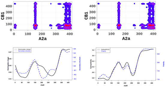 In order to better understand the nature of the interactions, we estimated the physicochemical properties of A2aR driving the heterodimerization with D2R by averaging known property metrics on the sequence length (Figure 2). We found that A2aR/D2R hot-spots correspond to regions with higher electrostatic charge and a higher secondary structure similarity score. In addition to the secondary structure folds and electrostatic properties, the dimerization of A2aR is also driven by the minor contributions of polarity and hydrophilicity, as shown in Figure 2. Similarly, the binding of A2aR to CB1R is also driven by electrostatic, polarity, hydrophilicity, and secondary structure interactions, as shown in Figure 3.
