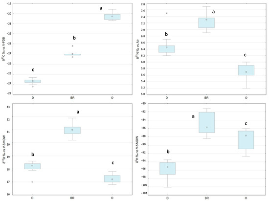 Figure 1. Isotopic value ranges for the three groups: Djebel (D), Bou-Rebiaa (BR), and Oueslatia (O). Statistically different groups (p < 0.01), according to the ANOVA, are denoted by different letters (a, b, c).
