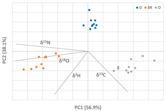 Although no information on the meat’s provenance was imported into the PCA, the plot reveals a clear clustering of the three different groups (D, BR, and O). A clear separation of the mentioned groups occurs in a direction almost parallel to PC2 (Figure 2) and both δ15N and δ(18O), being collinear with it, seem to be the discriminant variables responsible for such separation. At the same time, a separation among groups is also noticeable along PC1 (between D and the rest of the dataset). Finally, the secant of PC1 and PC2 axes collinear to δ(13C) seems to isolate the O group from the rest of the dataset, while the secant of PC1 and PC2 axes collinear to δ(2H) seems to isolate the BR group. On this basis, the two parameters seem to be the discriminant variables responsible for each separation.