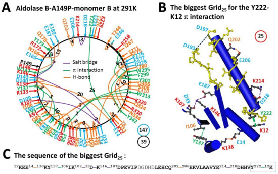 The grid-like non-covalently interacting mesh network along the single polypeptide chain of ligand-free monomer B in the aldolase B-A149P tetramer at 291 K. (A) The topological grids in the systemic fluidic grid-like mesh network. The X-ray crystallographic structure of monomer A in aldolase B-A149P at 291 K (PDB ID, 1XDM) was used for the model [2]. Salt bridges, π interactions, and H-bonds between pairing amino acid side chains along the single polypeptide chain from T8 to Y342 are marked in purple, green, and orange, respectively. The grid sizes required to control the relevant non-covalent interactions were calculated with graph theory and labeled in black. The total grid sizes and grid size-controlled non-covalent interactions along the single polypeptide chain are shown in the blue and black circles, respectively. (B) The structure of the biggest Grid25. The grid size is shown in a red circle. (C) The sequence of the biggest Grid25 to control the Y222-K12 CH-π interaction in a blue box.