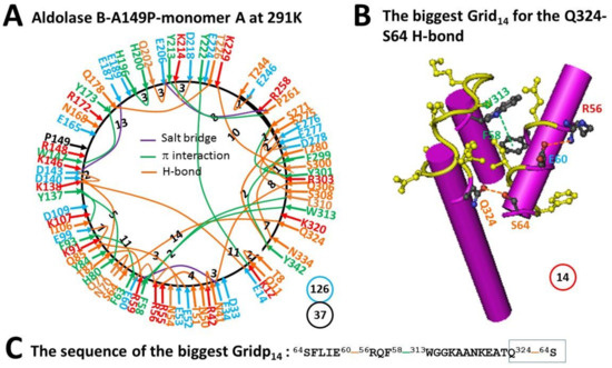 The grid-like non-covalently interacting mesh network along the single polypeptide chain of ligand-free monomer A in the aldolase B-A149P tetramer at 291 K. (A) The topological grids in the systemic fluidic grid-like mesh network. The X-ray crystallographic structure of monomer A in aldolase B-A149P at 291 K (PDB ID, 1XDM) was used for the model [2]. Salt bridges, π interactions, and H-bonds between pairing amino acid side chains along the single polypeptide chain from T8 to Y342 are marked in purple, green, and orange, respectively. The grid sizes required to control the relevant non-covalent interactions were calculated with graph theory and labeled in black. The total grid sizes and grid size-controlled non-covalent interactions along the single polypeptide chain are shown in the blue and black circles, respectively. (B) The structure of the biggest Grid14. The grid size is shown in a red circle. (C) The sequence of the biggest Grid14 to control the S64-Q324 H-bond in a blue box.